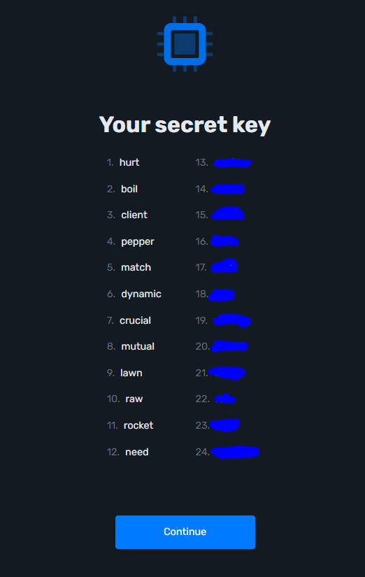3. A window will appear with 24 words that you need to save in the order in which they are listed. We suggest that you write them on pieces of paper and keep them in safe places.