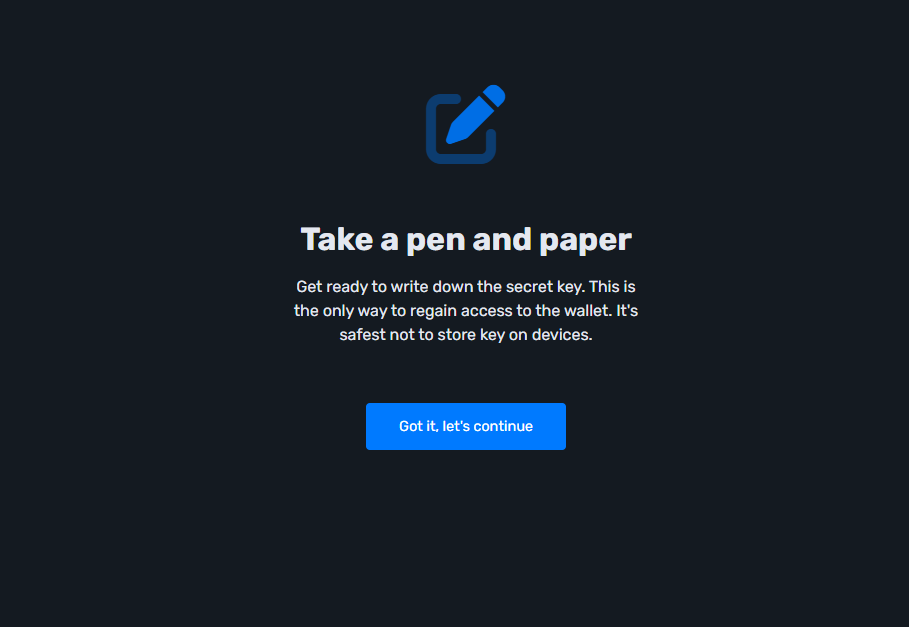 2. A window will appear warning you to take a pen and paper to write down the seed phrases: Click "Got it, let's continue."